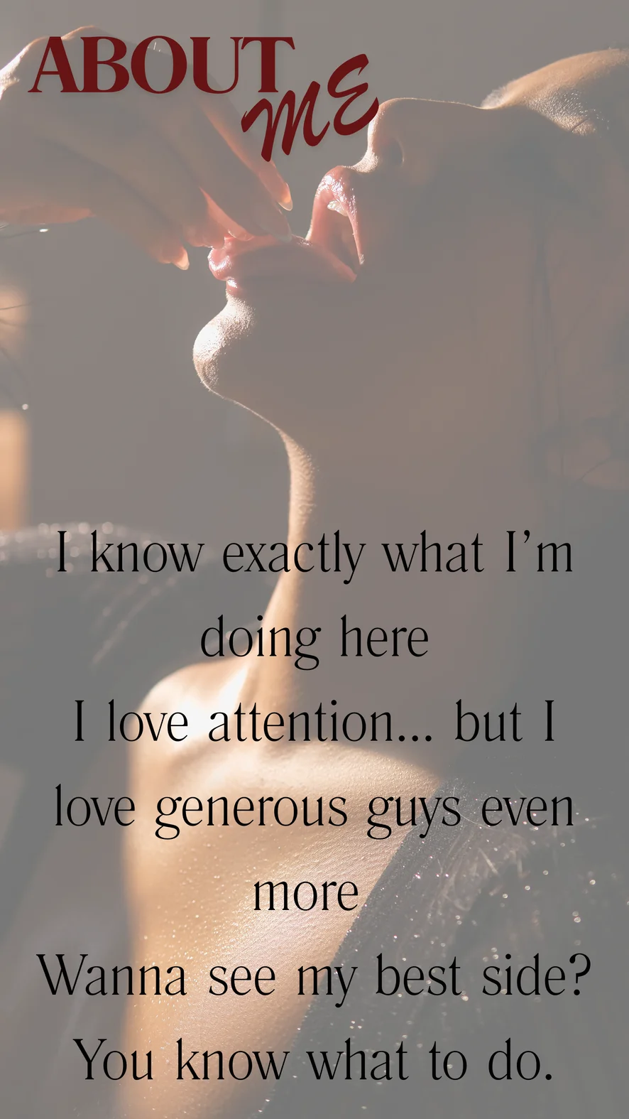 I am a sensual, daring, tender and elegant woman, I love to feel unique, I love to please and fill the person behind the screen with desire and emotions